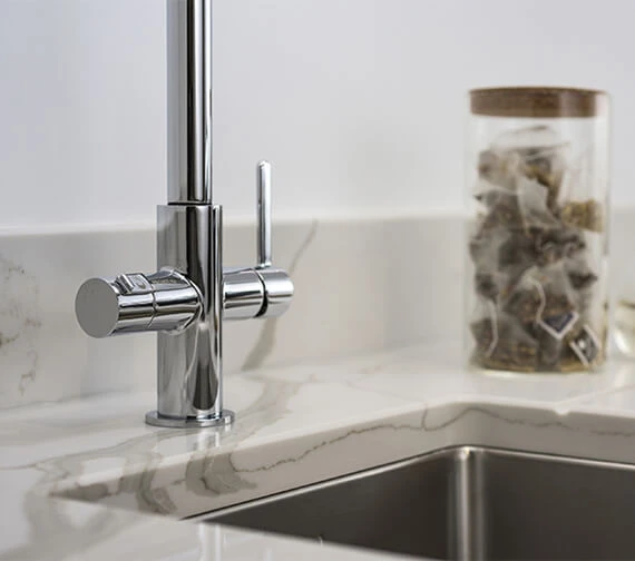 The lever is a vertical compact yet easy-to-grasp handle that works with the innovative ceramic disc to allow for more precise mixing of the water to give you domestic hot, cold and heated filtered water. Thanks to its safety features, you can avoid any possible scalding accidents. This deck-mounted model can be purchased in five finish choices and is simple to keep clean-just; wipe it with a clean microfibre cloth.