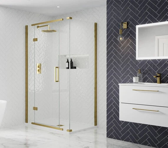 - The striking brushed brass Inline 2 Sided enclosure combines premium materials to create an undeniable style statement in any bathroom.