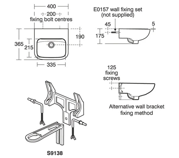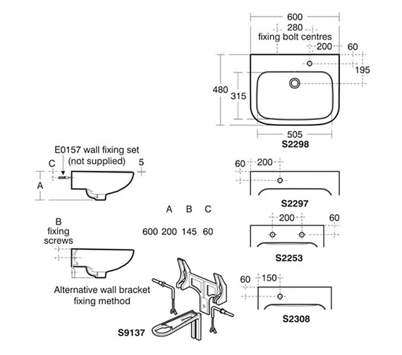 - Washbasin wall mounted using E015767 wall fixing set, or panel mounted using E006267 fixing set.