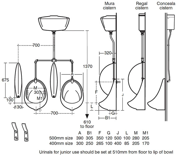 - For juniors, set the urinal at 510mm from floor to lip of the bowl.