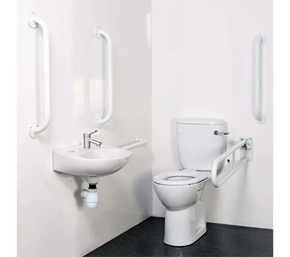 - Pack includes; 4 x 600mm grab rails, 1 x 450mm grab rail, 1 x 800mm hinged grab rail, 1 x close coupled WC pan and cistern, 1 x ring only toilet seat, 1 x two tap-hole basin and fittings, 1 x TMV3 basin mixer tap, 1 x spatula cistern lever.