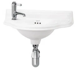 This traditional design basin comes with two practically convenient pre-drilled tap holes. Burlington provides a 25-year guarantee on this basin. This traditional sink can be easily mounted on the wall and is easy to clean. Although the basin has a short projection of 255mm, it offers enough room to wash hands.