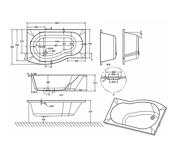 - Specification of 1500 x 900mm left hand :.