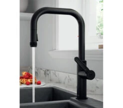 - The pull-out spout adds to this tap’s versatility with its switch-controlled flow options providing aerated water for filling and needle jet spray for rinsing.