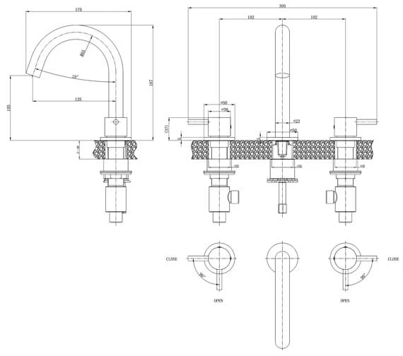 - Centre of the inlet to centre of outlet: 135mm.