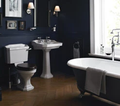 With its luxurious appeal and top-notch quality, this Granley Bathroom Suite from Heritage will redefine the parameters of styling in your bathroom. This bathroom suite comprises a basin and pedestal with chrome taps and basin waste, close-coupled WC with soft close seat and cistern including lever, freestanding bath with chrome feet, exposed waste, standpipes and .