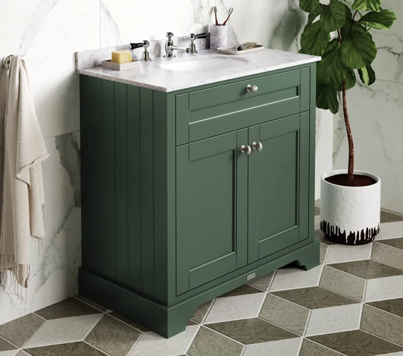 The Hudson Reed Old London Floor Standing Vanity Unit and Basin with Marble Worktop is supplied rigid for truly efficient installation and includes a knob-style handle and soft closing doors. Complete with a classic white ceramic basin on top and suitable for placement within any modern or traditional bathroom layout. This product does not include the tap or the waste shown in the accompanying image.