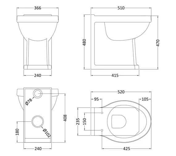 - Sizes of WC Pan with comfort height: 366 x 520 x 480mm [Width x Projection x Height].