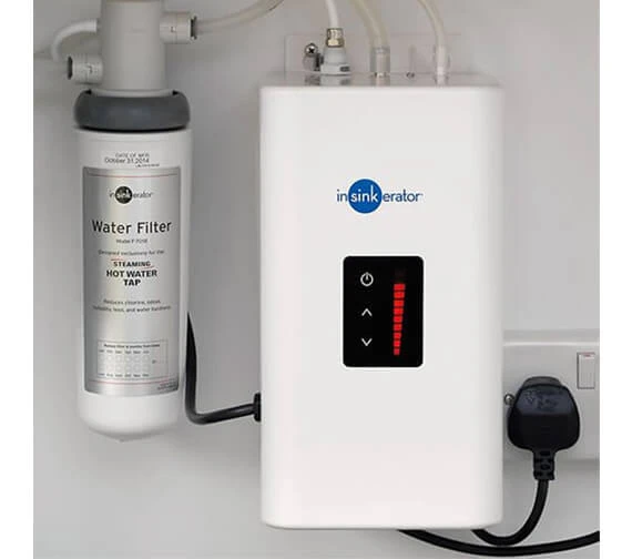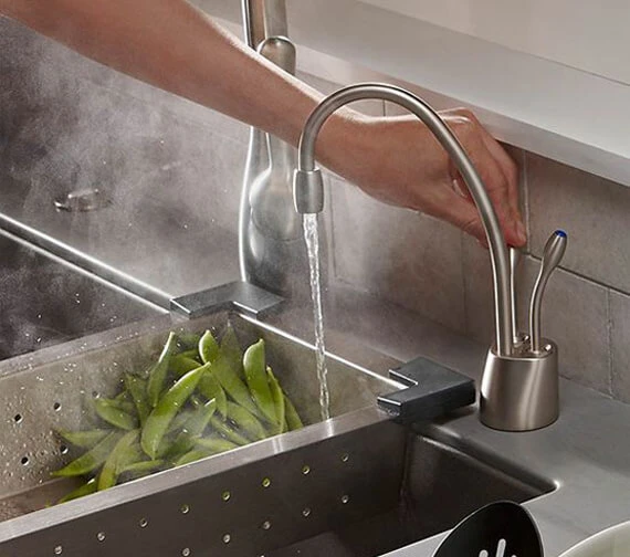 The Insinkerator HC1100 Steaming Hot Water Tap with Tank is a compact and convenient unit that produces approximately 100 cups of near-boiling water per hour if desired. Offering both hot and cold filtered water for use, this unit also includes a tank with an adjustable digital thermostat that allows you to set your preferred temperature between 88 and 99-degrees Celsius. Also boasting an easy to replace filter and a chic, contemporary appearance, this model is especially suitable for installation within any modern kitchen layout. A WRAS approved unit that features a smooth, swivelling spout and a gentle touch dispenser that gets the water flowing at only the touch of a button.