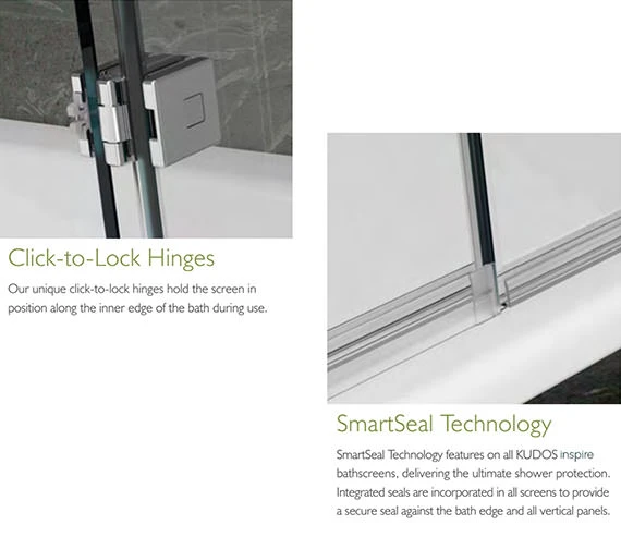 The Kudos Inspire Two Panel In-Fold Bath screen is available in both 6mm and 8mm thicknesses and comes in left and right-hand versions as well-you can choose the option you need. Complete with unique, click to lock hinges that hold the screen in place during use, this unit also includes truly innovative SmartSeal technology that is even suitable for high-performance showering. Complete with a 500mm fixed panel that is permanently this product also includes a 375mm smaller folding panel that sits behind the fixed panel and allows easy access to the shower when not in use.