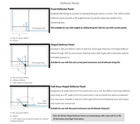 Note: Sizes shown are nominal. All panels are undersized by 45mm to allow for tiling when fitting to shower trays and Fixed Deflector Panel is not suitable for use with angled or ceiling fixing kit.