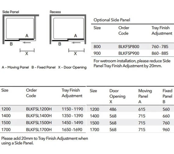 - For wetroom installation, please reduce Side Panel Tray Finish Adjustment by 20mm.