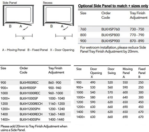 - Please reduce Side Panel Tray Finish Adjustment for wetroom installation by 20mm.