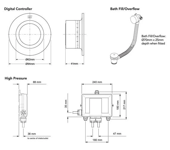 The Mira Mode Digital Controller with Overflow Bath Filler is suitable for installation within any modern bathroom design and features thermostatic temperature stability with digital intelligence as well. Supplied with push-fit isolators and rotary temperature control dial, and comes in several personalised bath fill options via the Mira Mode app. A great way for any user to enjoy a bath as quickly as possible; this product fills at up to a 15 litre per minute rate and stops before overflowing with ease as well. Complete with replaceable valves and filters, this product is remote controlled and features lights even on the remote itself.
