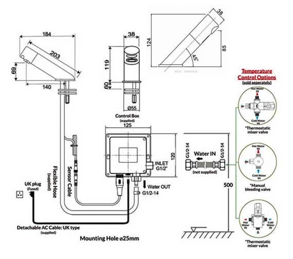 The RAK Compact Commercial Angled Deck Mounted Infra-Red Tap is an innovative, hands-free design that features a sensor that turns it on and off for use. Created for secure deck-mounted installation and features a cartridge that provides smooth operation; this product is mainly powered only and does not include thermostatic mixing valves and a sensor tap remote control that can be purchased separately if desired. Complete with a ½” BSP inlet connection and a spout reach of 184mm, this product operates best between a minimum water pressure of .5 bar to a maximum water pressure of 6 bar.