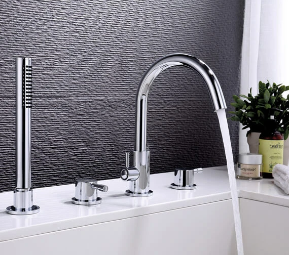 The RAK Prima Tech 4-Hole Bath Shower Mixer Tap Deck Mounted is a remarkably stylish and incredibly high-quality unit, ideal for placement within any compatible modern or contemporary bathrooms layout. Constructed from strong and durable brass material and coated in a stunning chrome finish that shines within any bath/shower set-up; this product is designed for deck-mounted installation and features simple to use lever handles that allow the user to control both the flow and the temperature of the water moving through it. Requiring 4 tap holes for proper installation and complete with a G ¾” BSP inlet connection, this unit also includes a spout reach of 190mm for use.