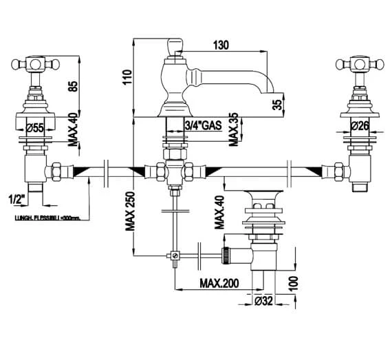 - Centre of the inlet to centre of outlet: 130mm.