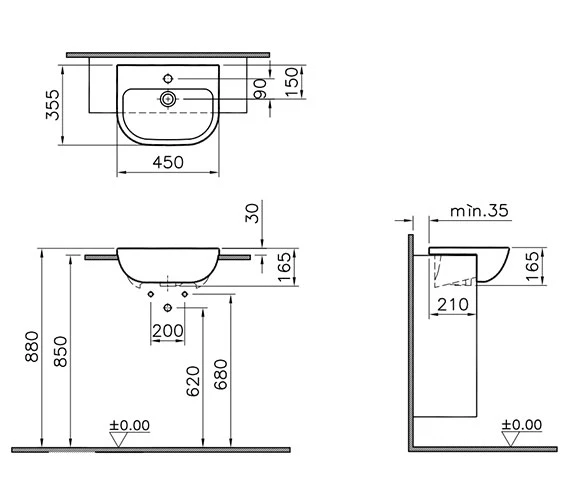 VitrA S20 1 Taphole 450mm White Semi-Recessed Basin